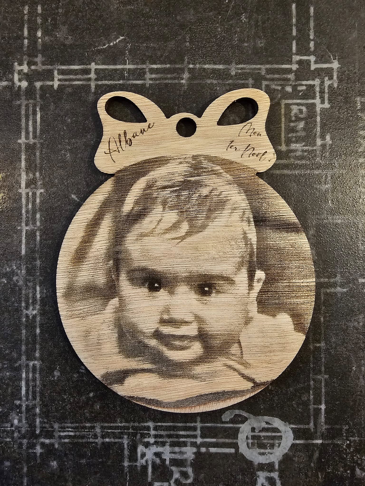 Grâce à la gravure laser de haute précision, nous réalisons vos photos, prénoms ou messages directement sur la boule pour un rendu élégant, durable et 100 % personnalisé.